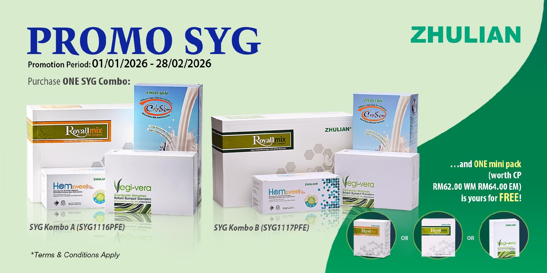 SYG Kombo A (SYG1116PFE) ColoSkim, Royallmix BD (30 sachets), Vegi-Vera (30 sachets) & HomsweetPlus | OR | SYG Kombo B (SYG1117PFE) ColoSkim, Royallmix KP (30 sachets), Vegi-Vera (30 sachets) & HomsweetPlus |