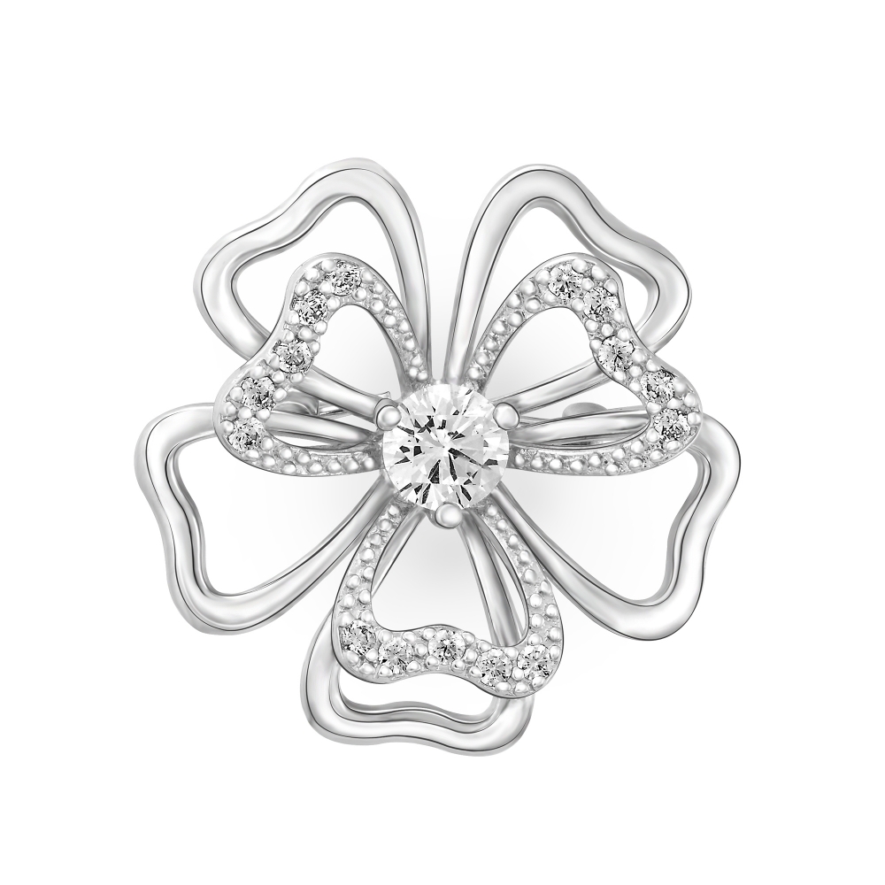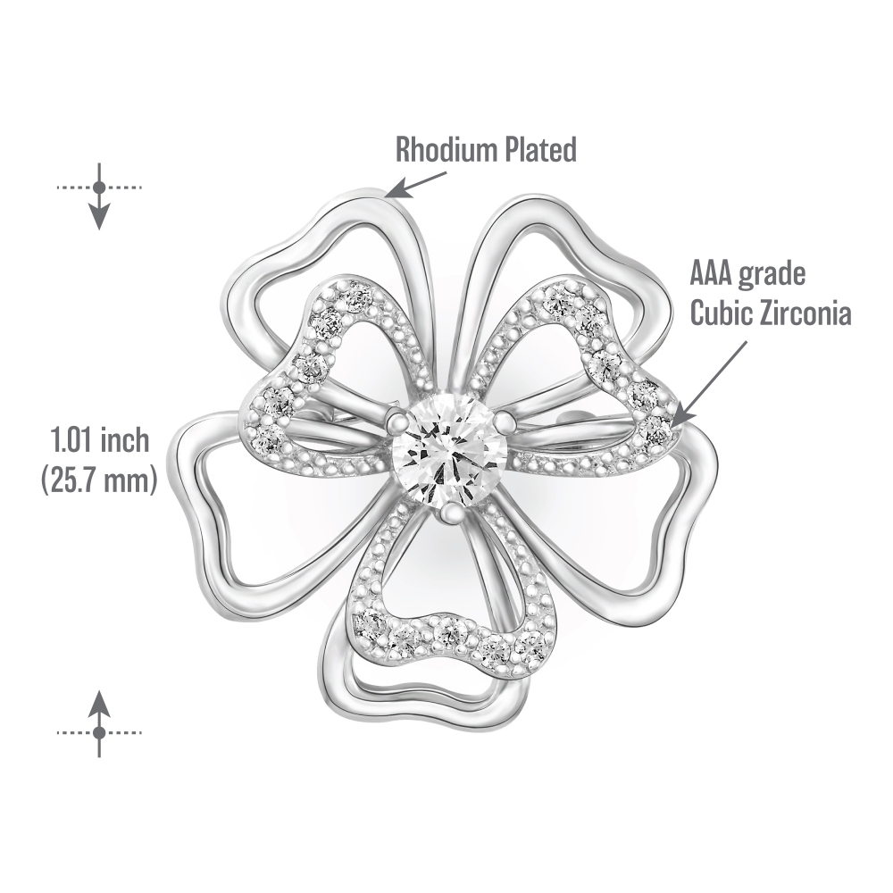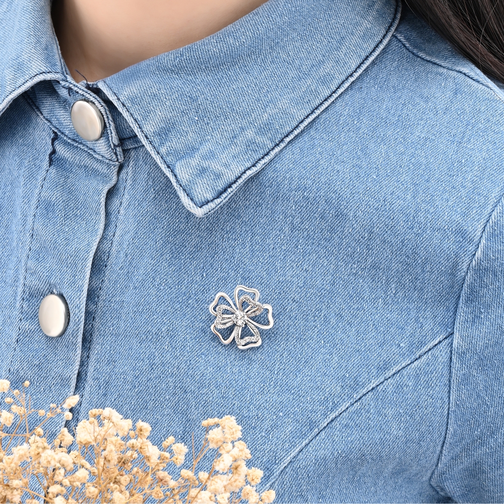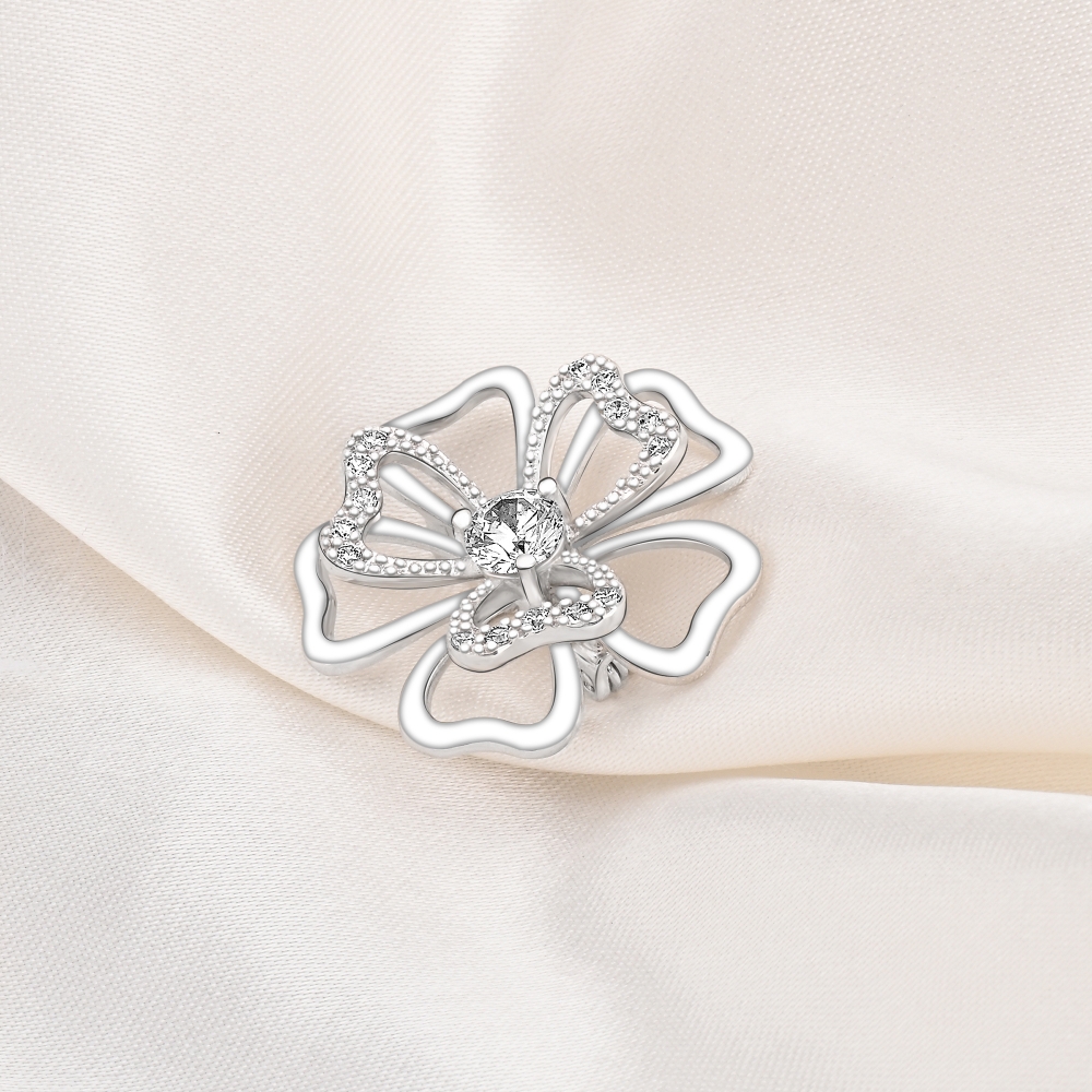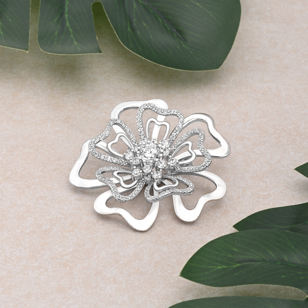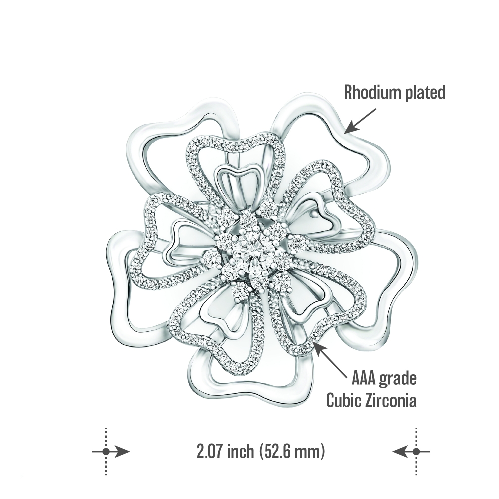This rhodium plated brooch features layers of delicate flower petals, creating a blooming flower effect that adds a touch of nature-inspired elegance to any outfit.