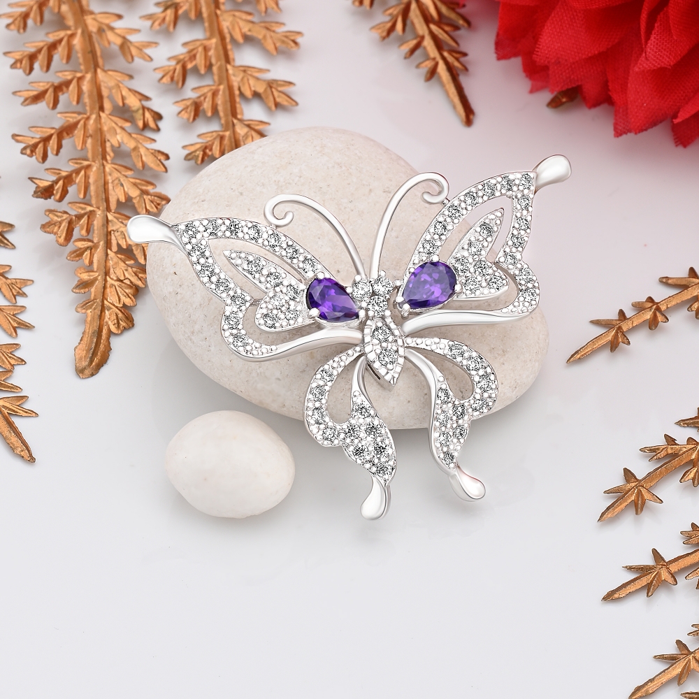 Add elegant flair to your with this rhodium plated butterfly brooch that adorned with purple synthetic stone