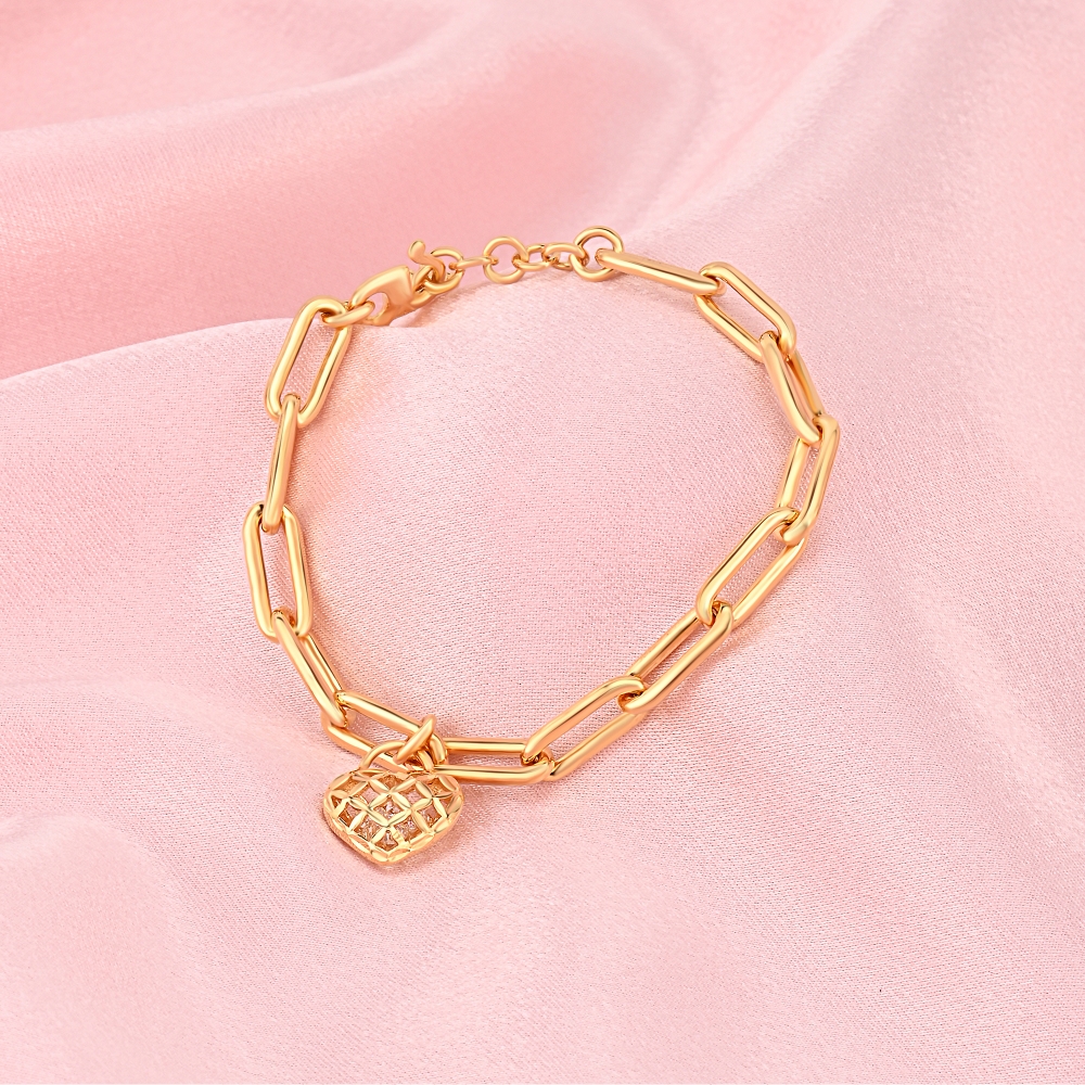 Featuring a captivating heart charm suspended delicately in paperclip chains, this bracelet is a combination of simplicty and modern style.