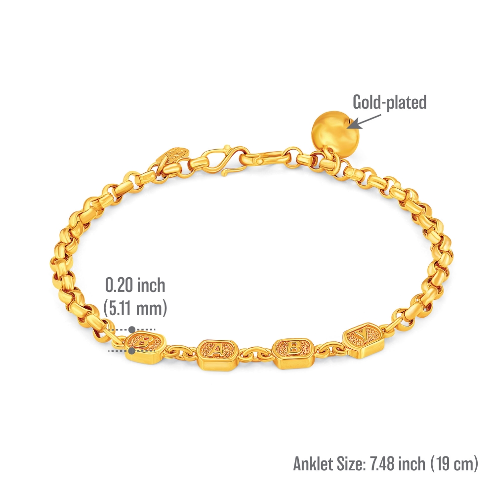 Crafted in gold plating, this adorable anklet featuring a classic cable chain design with a bell and complete with tiny initial charms that spells out the word - 'Baby'.