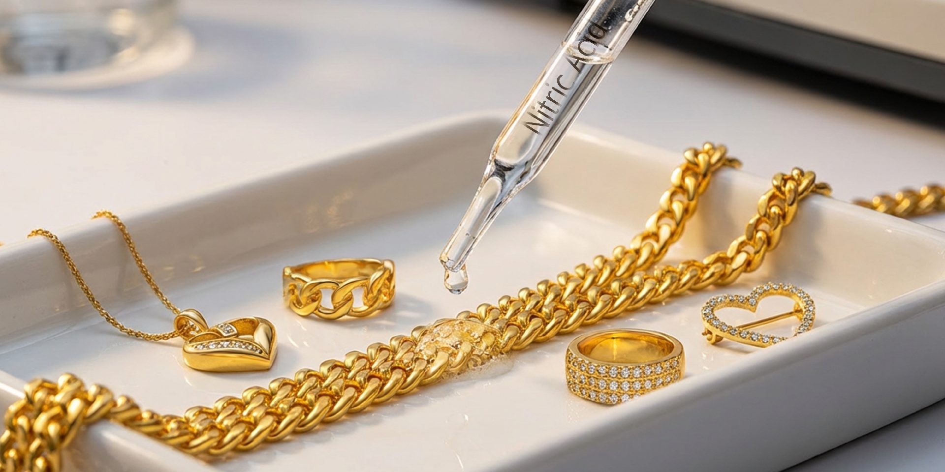 Place your jewellery pieces on a stainless steel plate, then pour 3 droplets of nitric acid onto the surface. If the jewellery turns dark or green coloured, it is gold-plated. If your jewellery has a white colored tone, it is silver with gold plating. If the piece did not change colour after the droplets of acid, it is pure gold.