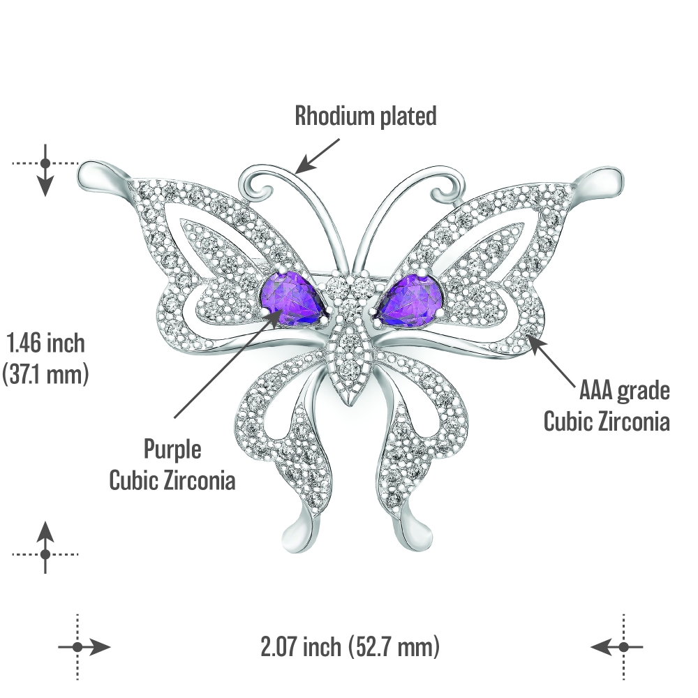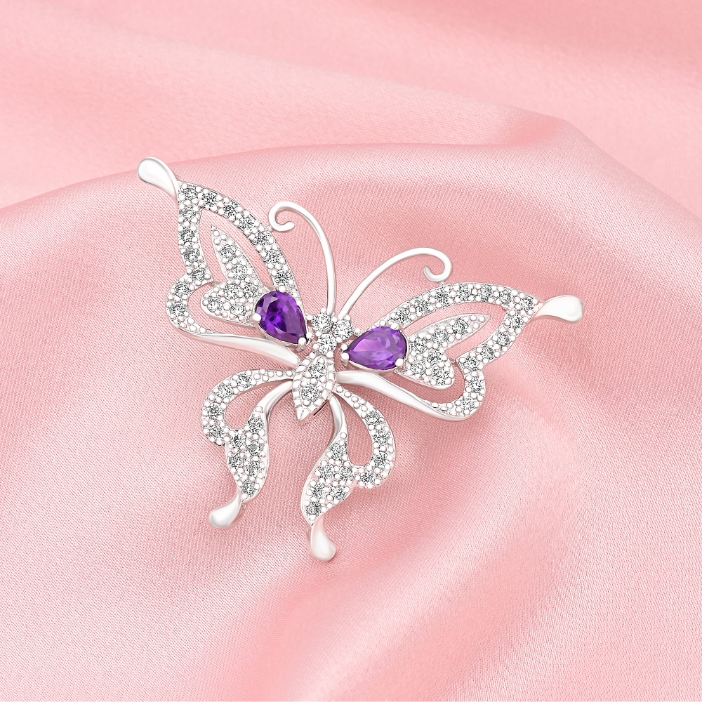 Add elegant flair to your with this rhodium plated butterfly brooch that adorned with purple synthetic stone