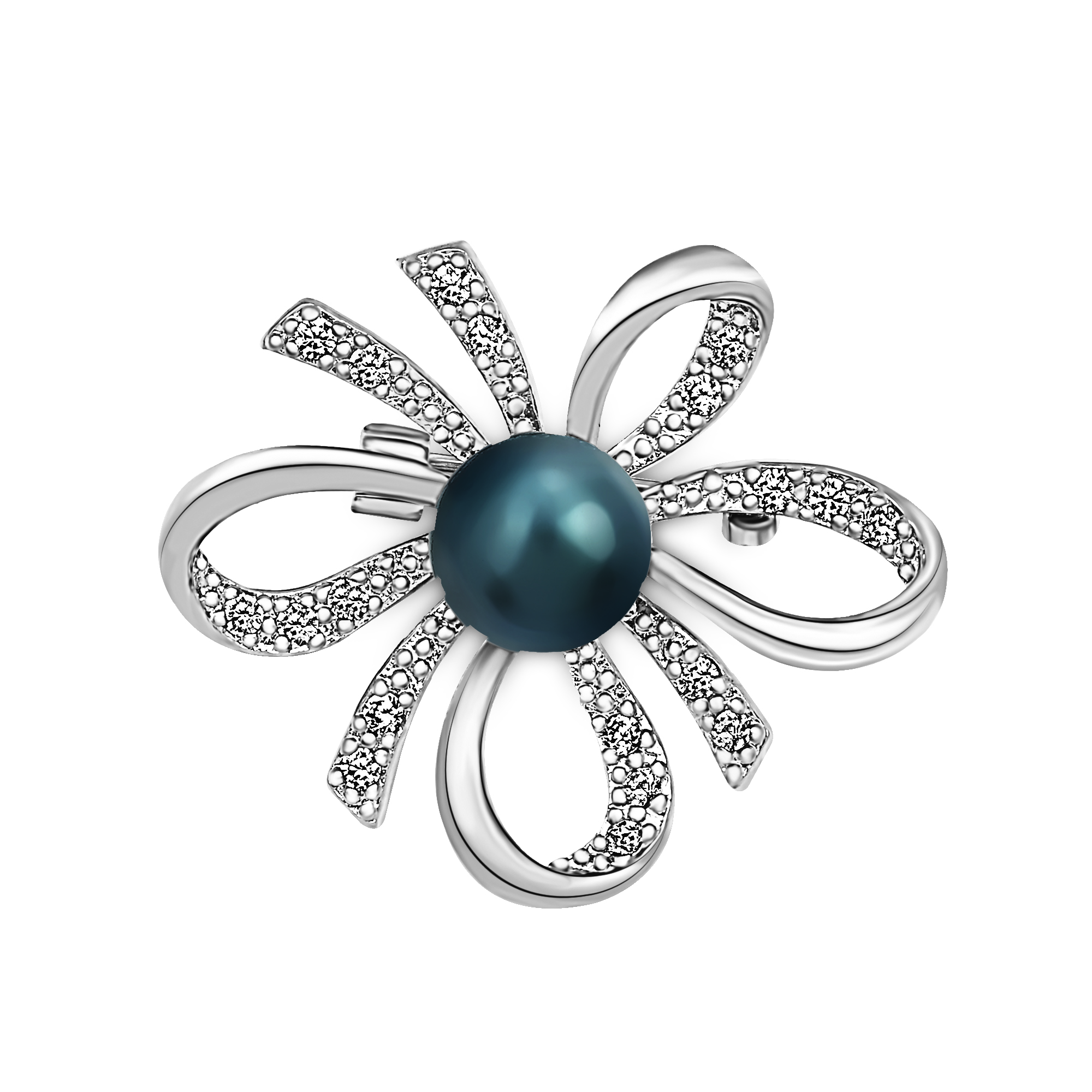 A rhodium plated brooch inspired by the cutesy vibe of a ribbon ruffle bedazzled with cubic zirconia and a synthetic black pearl as centerpiece.