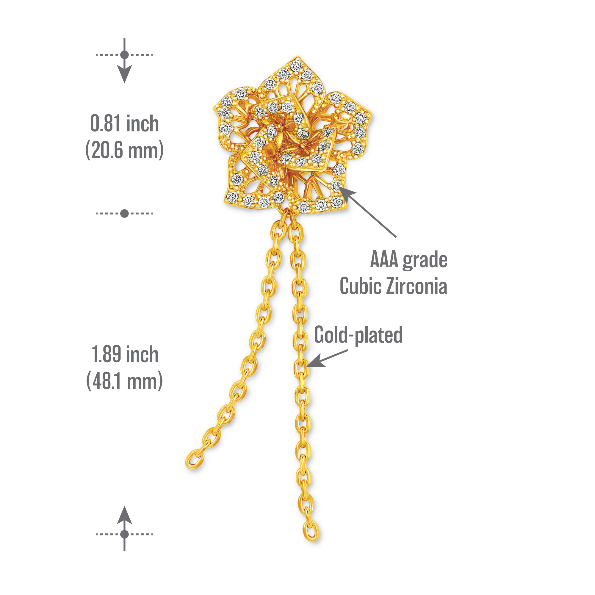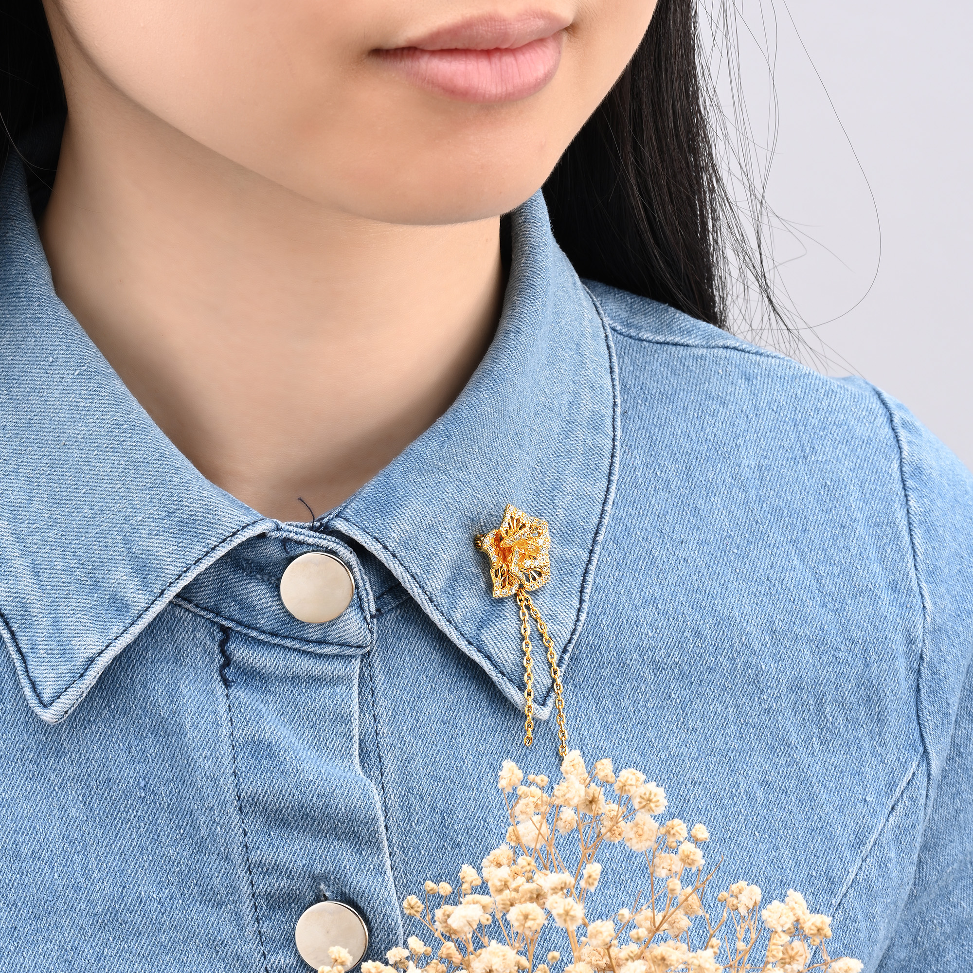 Elegance blooms anew with this intricately layered brooch, featuring delicate petals arranged in a timeless rose design. The simple dangling chains add a soft touch to the whole look.