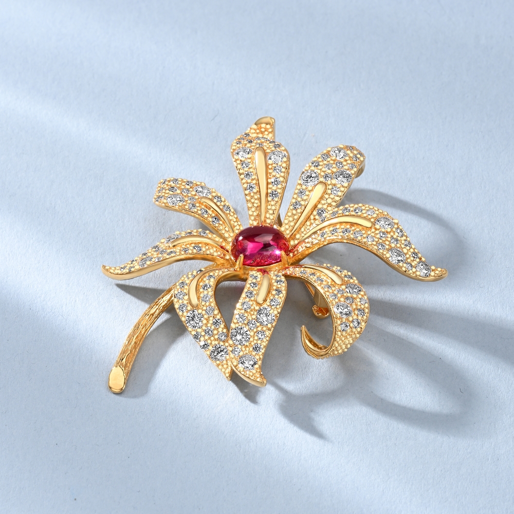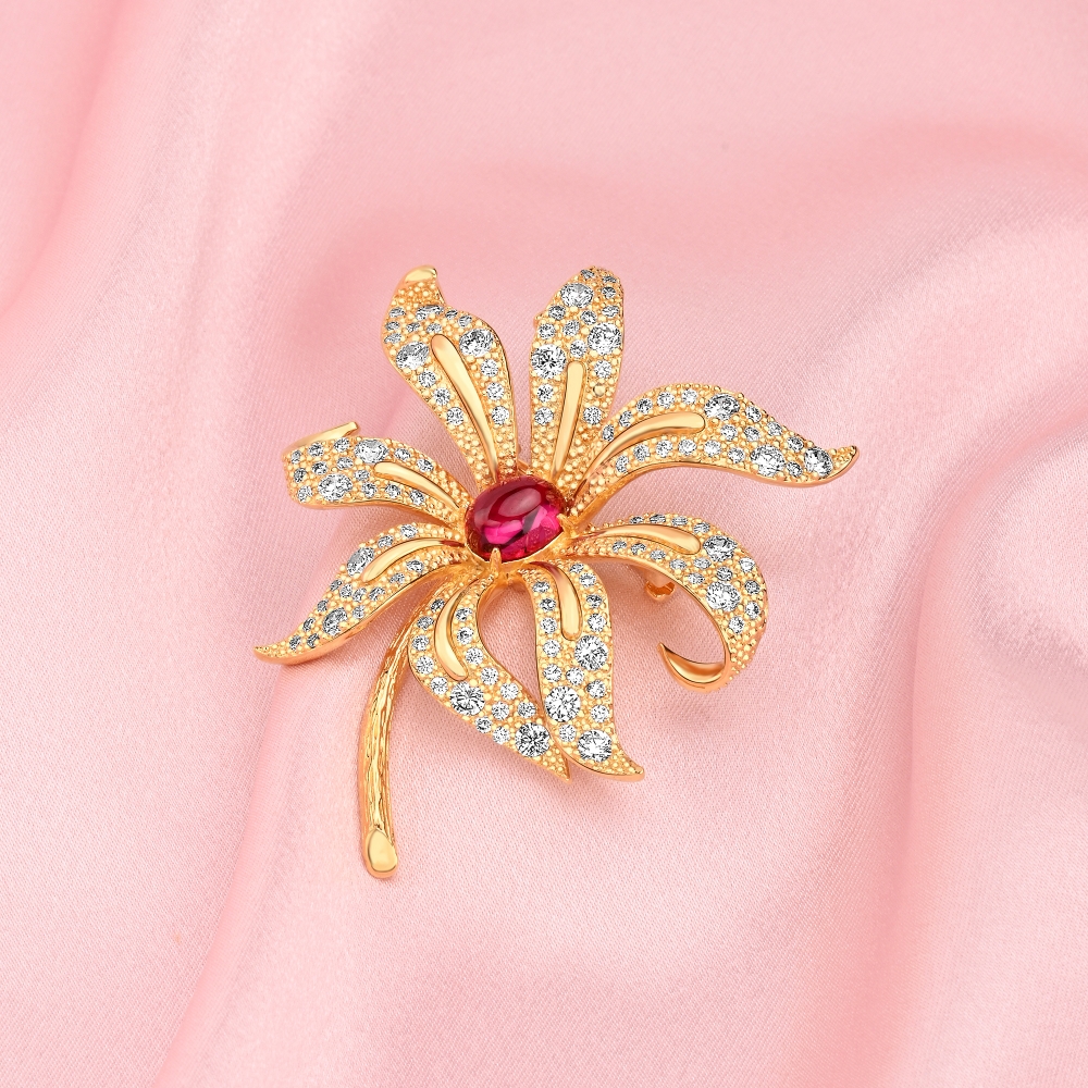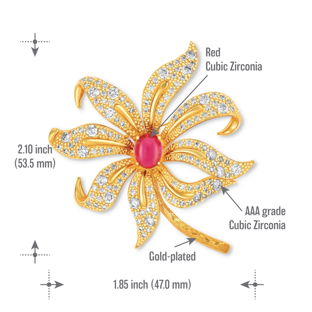 This brooch embodies elegance with its delicate lily-inspired design, capturing the delicate beauty of the flower in its intricate petals paved with CZ and further adorned with red synthetic Ruby as centrepiece.